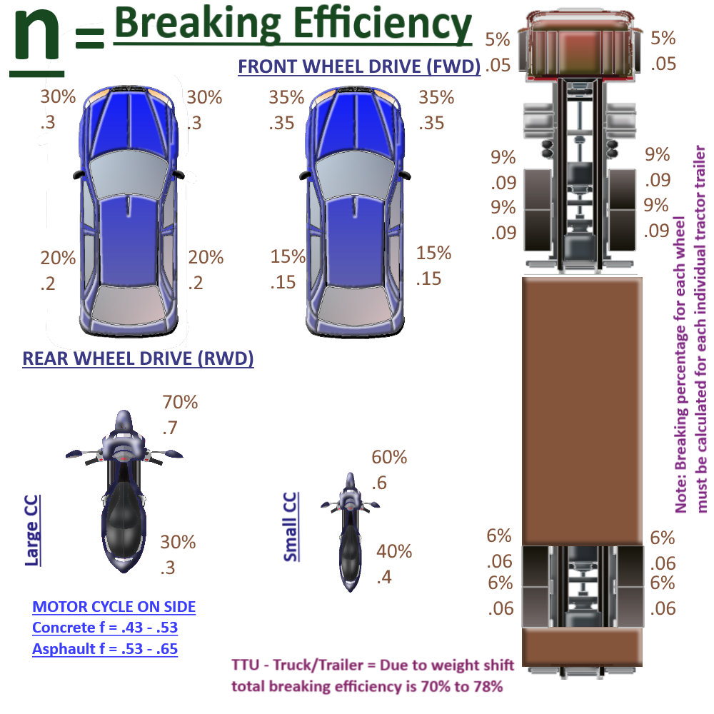 We said the vehicle is FRONT WHEEL DRIVE (FWD) and according to Breaking Efficiency diagram above the LEFT FRONT(LF) tire provides 35% = .35 of the vehicles breaking and the RIGHT FRONT (RF) tire provides 35% = .35 of our vehicle's breaking, and the two rear tires (LR, RR) each provide 15% = .15, but the two rear breaks were Not Working(NW), so they are providing no breaking or 0% = .0.